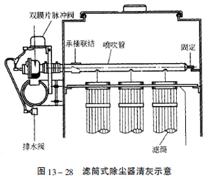 由于濾芯本身是一個硬固體,不再配置骨架,所以濾芯的清灰與傳統(tǒng)的濾袋清灰不同。圖13—28所示是用一個脈沖閥噴吹三個排在一起的濾芯。濾芯的總過濾面積應有限制。