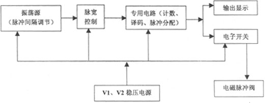 本控制儀由雙時基電路CH7556的1/2作為無穩(wěn)態(tài)多諧振蕩器產生周期為1~99秒的可調脈沖信號;另1/2作為單穩(wěn)態(tài)電路完成計數(shù)、譯碼、脈沖分配等一系列邏輯功能,再由專用電路的各輸出端輸出所設定的脈沖寬度信號至電子開關(VMOS電路),控制電磁脈沖閥的開啟,噴吹壓縮空氣,同時由數(shù)碼管顯示噴吹順序。