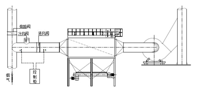 煙氣溫度一旦高于除塵器正常使用溫度,自動控溫裝置啟動冷風(fēng)閥,放進冷風(fēng),同時電鈴自動報警,提示操作工采取降溫措施;當(dāng)煙氣溫度降至正常使用溫度時,冷風(fēng)閥自動關(guān)閉,操作也恢復(fù)正常;當(dāng)采取放冷風(fēng)后,煙氣溫度仍超過除塵器的允許O高溫度時,進風(fēng)閥會自動關(guān)閉,旁路閥打開,煙氣進入旁路煙道排空,確保除塵器的安全運行。